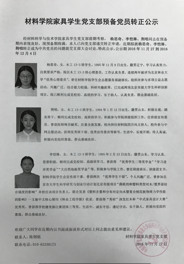 材料学院家具学生党支部预备党员转正公示