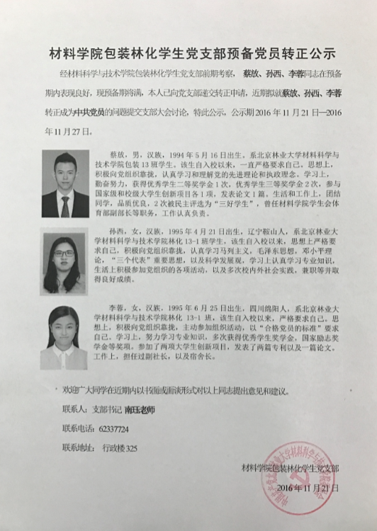 材料学院包装林化学生党支部预备党员转正公示