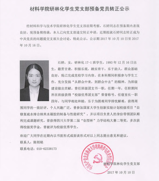 材料学院研林化第二党支部预备党员转正公示