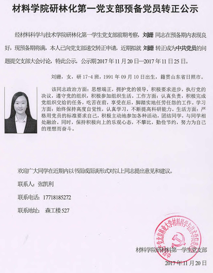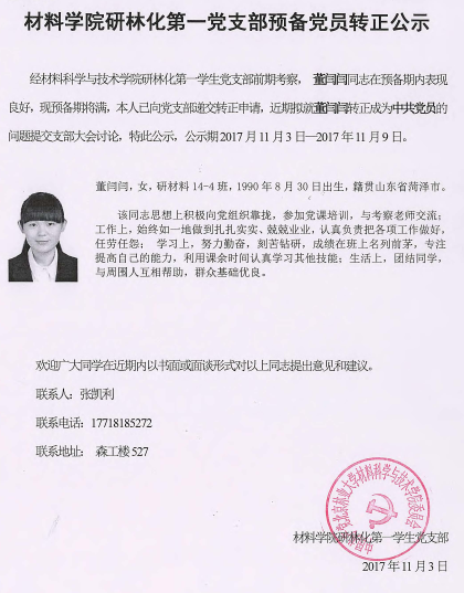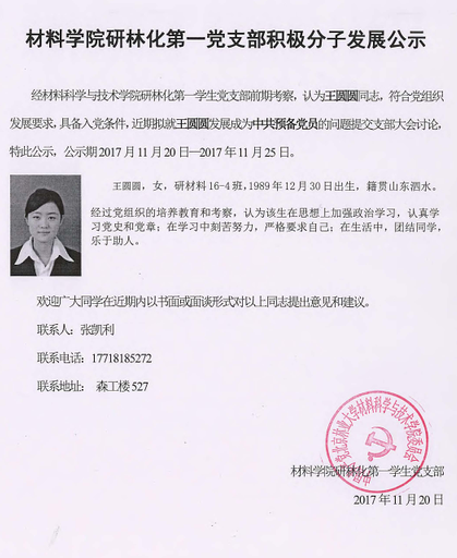 经我党支部审查,刘姗同志和董闫闫同志,正在预备期内表现良好,符合党组织转正要求,拟于近期转正为中共党员;王圆圆同志经过前期考察,符合党员发展要求,拟于近期发展成为中共预备党员,现予公示。公示时间:2017年11月20日-2017年11月25日。公示材料如下: