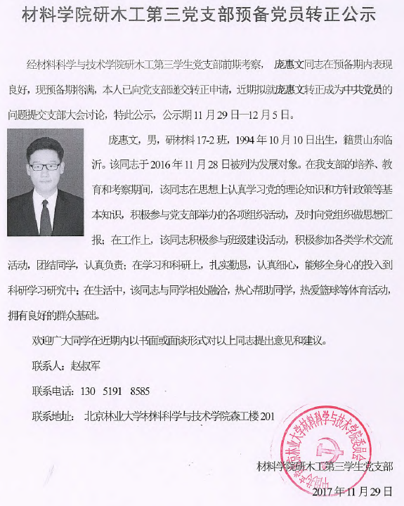 经材料科学与技术学院研木工第三学生党支部前期考察, 庞惠文同志在预备期内表现良好,现预备期将满,本人已向党支部递交转正申请,近期拟就庞惠文转正成为中共党员的问题提交支部大会讨论,特此公示,公示期11月29日—12月5日。
