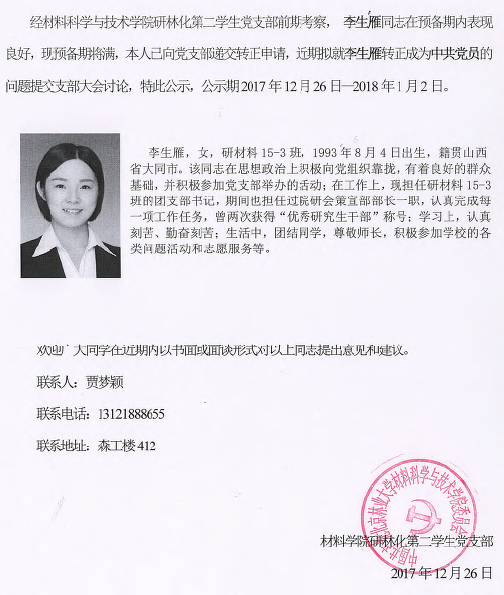 经材料科学与技术学院研林化第二学生党支部前期考察, 李生雁同志在预备期内表现良好,现预备期将满,本人已向党支部递交转正申请,近期拟就李生雁转正成为中共党员的问题提交支部大会讨论,特此公示,公示期2017年12月26日—2018年1月2日。