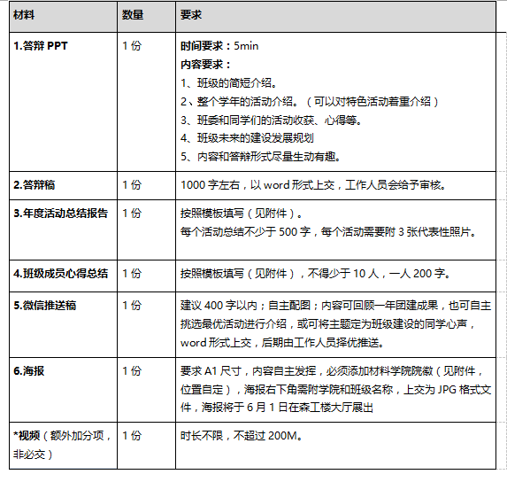 本学期即将过去,依照《材料学院基层班级活动实施方案》,各个班级必须在5月份完成班级活动立项表上的所有活动,并需要按要求提交终期活动材料、参加终期答辩。请各基层班级班委认真负责,做好本学年班级团建最后的收尾工作。若出现未完成立项表内容,未按要求提交终期活动材料和不参加年度答辩的班级,所有成员将无法获得相应综评加分。且取消班级优良学风班和十佳班集体的评选资格。