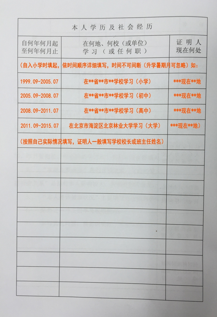 3、“本人学历及社会经历”自入小学时起,依时间顺序详细填写,年月要衔接。中途间断学习和工作的时间也要填入,并加说明。