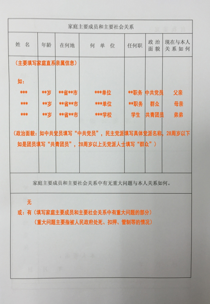 4、“家庭主要成员”是指直系亲属(父母和爱人、子女)。“主要社会关系”是指对本人影响较大、关系密切的亲友。
