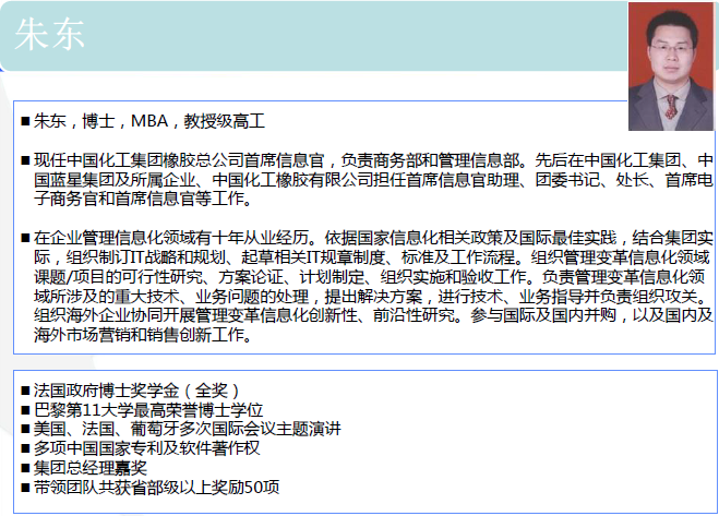 朱东,博士、MBA、教授级高工,现任中国化工集团橡胶总公司首席信息官。先后在中国化工集团、中国蓝星集团、中国化工橡胶有限公司工作,历任处长、首席电子商务官、首席信息官等职务。